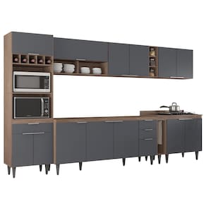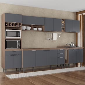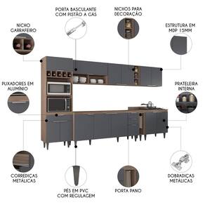 O Paneleiro conta com dois compartimentos para acomodar micro-ondas e forno elétrico, e cinco nichos na parte superior. Ele também inclui três portas, sendo uma delas basculante, além de uma gaveta para melhor organização dos seus utensílios. Os Armários Aéreos dispõe de quatro portas convencionais, uma porta basculante com pistão a gás, dois nichos e duas prateleiras internas, agregando praticidade e estilo. O Balcão Para Pia e o Balcão 80cm com Tampo possuem seis portas e duas gavetas, com duas prateleiras internas que oferecem amplo espaço de armazenamento. Já o Balcão Porta Pano traz um suporte de aço para guardanapos e o nicho adega que conta com três repartições. Todos os móveis possuem estrutura em MDP 15mm, com acabamento em BP, puxadores em alumínio, dobradiças e corrediças metálicas, que garantem máxima resistência no uso diário. Os pés em PVC, são reguláveis, permitindo ajustar pequenos desníveis de piso. O balcão gabinete não acompanha tampo para que o uso fique opcional com tampo ou pia. Este Armário de Cozinha é a solução ideal para otimizar sua casa, combinando materiais de alta qualidade com um design sofisticado.