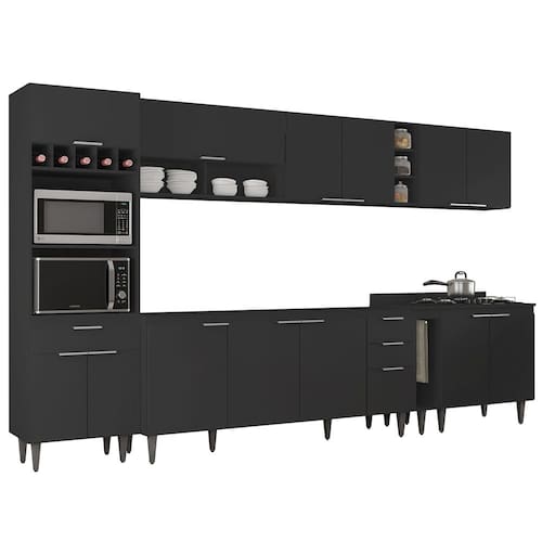 Conteúdo da Embalagem: 1 Armário Aéreo 100cm, 2 Armários Aéreos 80cm, 1 Balcão 178cm, 1 Balcão 80cm, 1 Balcão Porta Pano, 1 Paneleiro, 1 Nicho Adega.