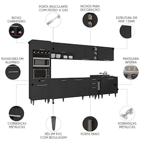 O Paneleiro conta com dois compartimentos para acomodar micro-ondas e forno elétrico, e cinco nichos na parte superior. Ele também inclui três portas, sendo uma delas basculante, além de uma gaveta para melhor organização dos seus utensílios. Os Armários Aéreos dispõe de quatro portas convencionais, uma porta basculante com pistão a gás, dois nichos e duas prateleiras internas, agregando praticidade e estilo. O Balcão Para Pia e o Balcão 80cm com Tampo possuem seis portas e duas gavetas, com duas prateleiras internas que oferecem amplo espaço de armazenamento. Já o Balcão Porta Pano traz um suporte de aço para guardanapos e o nicho adega que conta com três repartições. Todos os móveis possuem estrutura em MDP 15mm, com acabamento em BP, puxadores em alumínio, dobradiças e corrediças metálicas, que garantem máxima resistência no uso diário. Os pés em PVC, são reguláveis, permitindo ajustar pequenos desníveis de piso. O balcão gabinete não acompanha tampo para que o uso fique opcional com tampo ou pia. Este Armário de Cozinha é a solução ideal para otimizar sua casa, combinando materiais de alta qualidade com um design sofisticado.