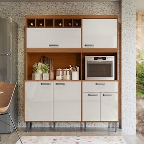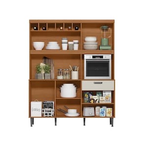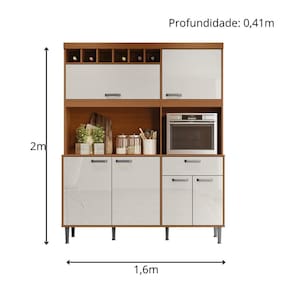 Espaço de Armazenamento InteligenteO Armário Dakota se destaca pelo amplo espaço de armazenamento. Com 5 portas, 1 gaveta, prateleiras e nichos, ele oferece a capacidade necessária para acomodar todos os seus utensílios e louças de forma organizada. Além disso, conta com um espaço especial para adega, perfeito para armazenar até 6 garrafas, e um compartimento para micro-ondas, facilitando o acesso aos eletrodomésticos mais utilizados.
