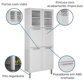 O Paneleiro Duplo Tarsila é ideal para quem procura um produto prático e funcional. Possui 6 portas sendo duas de vidros, 6 prateleiras que dispõem um amplo espaço para guardar o que você precisa, pés reguláveis que garante firmeza e resistência ao móvel, puxadores metálicos. Trazendo um design moderno para sua cozinha.