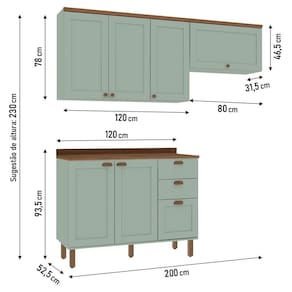 Inclui manual de montagem: Sim | Profundidade: 52,5 cm | Altura: 230 cm | Requer montagem: Sim | Comprimento: 52,5 cm | Fabricante: Genialflex | Material: MDF | Cor: Verde Mint | Produto: Armário | Altura do Produto (cm): 230 | Comprimento do Produto (cm): 52,5 | Material para Filtro: MDF | batteries_required: Não | Largura do Produto (cm): 200 | Altura do Produto Com Embalagem (cm): 40,9, | Comprimento do Produto Com Embalagem (cm): 157,1 | included_components: Ferragens | Materiais do corpo: MDF | number_of_boxes: 8 | part_number: Não aplicável | is_assembly_required: Sim | item_weight: 97,126 | Descrição do Tamanho: 200 x 230 x 52,5 | is_fragile: Não | Tipo de móveis de cozinha: Armário | Largura do Produto Com Embalagem (cm): 60,6 | model_number: CB0056.01 | number_of_items: 1 | Peso Produto Com Embalagem (Kg): 104,109 | Peso do Produto (Kg): 97,126 | external_testing_certification: Não aplicável | item_depth_width_height: 52,5 x 200 x 230 | bullet_point_#0: Beleza e praticidade no seu dia a dia O Armário de Cozinha Genialflex Iluminata Flora Verde Mint transforma seu espaço com um design moderno, elegante e funcional, no tom Verde Mint suave combinado ao tampo amadeirado Ébano. | bullet_point_#1: Organização com estilo Módulos bem divididos (balcão, armários e aéreo) que oferecem espaço de sobra para utensílios, mantimentos e louças, mantendo tudo sempre à mão e com aquele toque sofisticado dos puxadores na cor champanhe. | bullet_point_#2: Qualidade que faz diferença Produzido 100% em MDF com portas no estilo provençal americano, dobradiças com amortecimento, corrediças telescópicas, pés reguláveis e divisor de talheres incluso para facilitar ainda mais sua rotina. | Manufacturer: Genialflex | power_source_type: Não aplicável | color: Verde Mint
