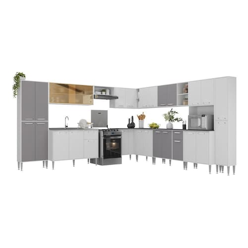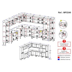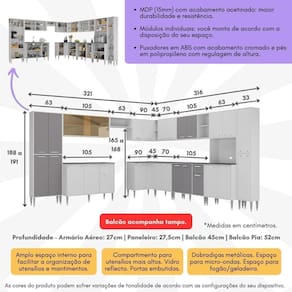 Dimensões do produto montado: Altura: 191cm | Largura: 321 x 316cm | Profundidade: 52cm (balcão) - 45cm (balcão de canto) - 27,5cm (paneleiro) - 27cm (armário aéreo) Espaço para fogão/geladeira: Altura: 168cm | Largura: 63cm *Você pode consultar as medidas detalhadas na imagem técnica do produto.