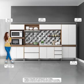 A Cozinha Sabrina Modulada foi desenvolvida para atender todas as suas necessidades do dia a dia com um design moderno, funcionalidade e versatilidade. A Cozinha Modulada é a tendência do momento e foi arquitetada com módulos úteis que vão facilitar a sua rotina diária, preparos dos alimentos e armazenamento dos utensílios e mantimentos, mantendo sua cozinha sempre organizada. Por se tratar de armários de cozinha modulados você pode ajustar os módulos conforme o espaço disponível e montar diversas modulações diferentes para deixar o ambiente muito mais aconchegante. A elegância fica por conta dos puxadores em perfil e os pés dando um toque único de sofisticação. A Cozinha Sabrina é produzida com materiais de excelente qualidade, garantindo a durabilidade e vida útil. O melhor em móveis no design atual aliando conforto, qualidade e ótimos preços, só na Menu Móveis!