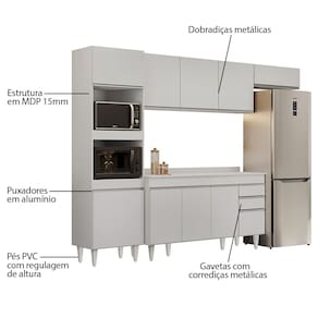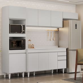 Com esse Kit de Cozinha, você vai contar com 1 Paneleiro com espaço para micro-ondas e forno elétrico, 1 Armário Aéreo 150cm 3 portas, 1 Armário Aéreo 70cm 1 porta basculante e 1 Balcão 150cm com Tampo 4 portas e 2 gavetas com corrediças metálicas, que deslizam suavemente. Além disso, possui puxadores em alumínio, agregando sofisticação ao ambiente e os pés em PVC são reguláveis, perfeitos para corrigir pequenos desníveis de piso.