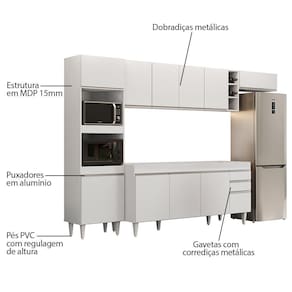 Com esse Kit para Cozinha, você vai contar com 1 Balcão 180cm sem tampo 4 portas 2 gavetas, 1 Paneleiro com espaço para micro-ondas e forno elétrico, 1 Armário 70cm com porta basculante, 1 Armário aéreo 160cm e 1 Nicho garrafeiro. A vantagem dos módulos é que você personalize o seu espaço, pois você pode escolher a disposição de cada móvel de acordo com a sua necessidade e preferência!