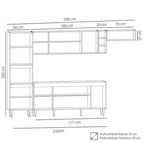 Conteúdo da Embalagem: 1 Balcão 180cm, 1 Armário Aéreo 160cm, 1 Nicho Riad, 1 Armários Aéreos 70cm, 1 Paneleiro.