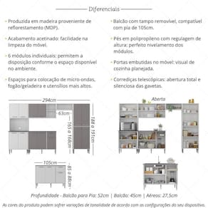 O conjunto conta com espaços dedicados para colocação de micro-ondas (até 9kg), utensílios mais altos e fogão ou geladeira. Os puxadores em ABS com acabamento cromado e os pés em polipropileno com regulagem de altura proporcionam estilo e um perfeito nivelamento aos módulos. O balcão de maior profundidade possui tampo removível e é com pia de 105cm, trazendo praticidade nas rotinas na cozinha. Pia NÃO inclusa. As portas são embutidas no móvel, oferecendo um visual de cozinha planejada.