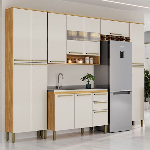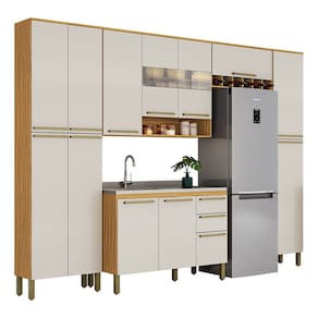 Armário de Cozinha Modulada com Balcão para Pia 13 Portas 2 Gavetas Xangai 100% Mdf com Vidro Reflecta Amêndoa/Off White - Pnr Móveis - Bege