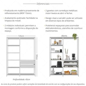 Especificações Técnicas: Dimensões do Produto Montado - Altura: 183cm | Largura: 135cm | Profundidade: 45cm Material: MDP 15mm Acabamento: Acetinado Quantidade de Prateleiras: 7 Quantidade de Gavetas: 2 Corrediças: Metálicas