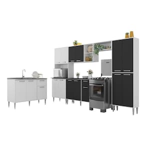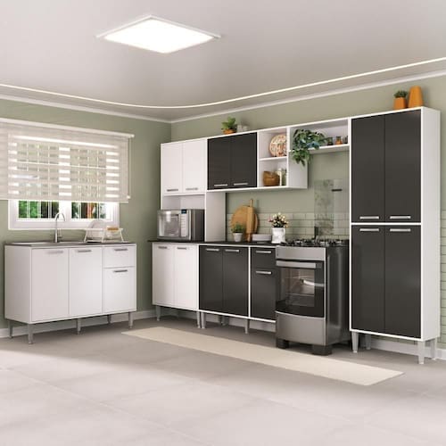 Produzida em MDP 15mm com acabamento acetinado (cerca de 20% de brilho), a cozinha garante resistência e facilidade na sua higienização. São 16 portas e 2 gavetas com corrediças telescópicas, que proporcionam abertura total e silenciosa, além de nichos versáteis para itens menores. O amplo espaço interno é suficiente para armazenar todos os seus utensílios de cozinha de forma eficiente e acessível.