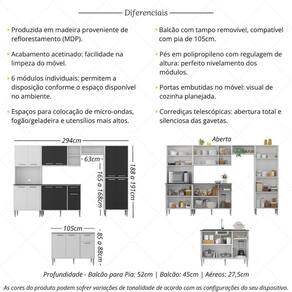 O conjunto conta com espaços dedicados para colocação de micro-ondas (até 9kg), utensílios mais altos e fogão ou geladeira. Os puxadores em ABS com acabamento cromado e os pés em polipropileno com regulagem de altura proporcionam estilo e um perfeito nivelamento aos módulos. O balcão de maior profundidade possui tampo removível e é com pia de 105cm, trazendo praticidade nas rotinas na cozinha. Pia NÃO inclusa. As portas são embutidas no móvel, oferecendo um visual de cozinha planejada.