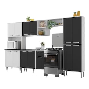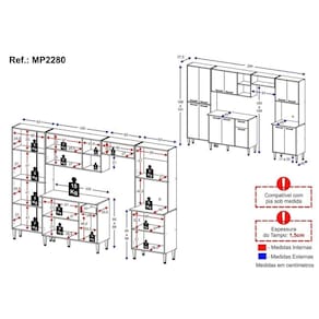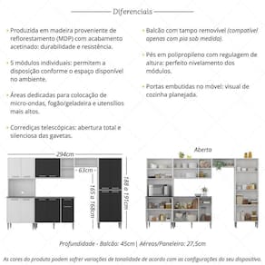 O conjunto conta com espaços dedicados para colocação de micro-ondas (até 9kg), utensílios mais altos e fogão ou geladeira. Os puxadores em ABS com acabamento cromado e os pés em polipropileno com regulagem de altura proporcionam estilo e um perfeito nivelamento aos módulos. O balcão possui tampo removível (devido à profundidade, apenas com pia sob medida), trazendo praticidade nas rotinas diárias. As portas e a gaveta são embutidas no móvel, oferecendo um visual de cozinha planejada.
