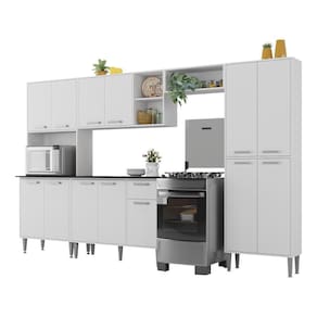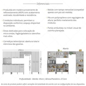O conjunto conta com espaços dedicados para colocação de micro-ondas (até 9kg), utensílios mais altos e fogão ou geladeira. Os puxadores em ABS com acabamento cromado e os pés em polipropileno com regulagem de altura proporcionam estilo e um perfeito nivelamento aos módulos. O balcão possui tampo removível (devido à profundidade, apenas com pia sob medida), trazendo praticidade nas rotinas diárias. As portas e a gaveta são embutidas no móvel, oferecendo um visual de cozinha planejada.