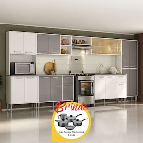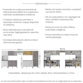 Funcionalidade e sofisticação: O conjunto conta com espaços dedicados para colocação de micro-ondas (até 9kg), utensílios mais altos e fogão ou geladeira. Os puxadores em ABS com acabamento cromado e os pés em polipropileno com regulagem de altura proporcionam estilo e um perfeito nivelamento aos módulos. Os balcões possuem tampos removíveis, um deles compatível com pia de 105cm (pia não inclusa), trazendo praticidade nas rotinas diárias. As portas e gavetas são embutidas no móvel, oferecendo um visual de cozinha planejada.