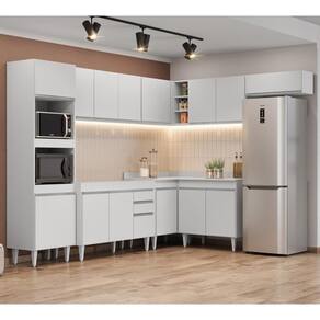 A começar pelo Paneleiro que conta com espaço para micro-ondas e forno elétrico, além de 2 portas para guardar seus utensílios. Na parte inferior você vai contar com 3 Balcões, o Balcão para Pia de 120cm sem tampo é versátil e pode ser personalizado com pia de inox ou granito, de acordo com a sua preferência, o Balcão 80cm com tampo possui 2 Portas e o Balcão de Canto com tampo auxilia na otimização do espaço para aproveitar todos os cantos do ambiente! Já na parte superior, você vai dispor de 4 Armários aéreos, Armário de Geladeira 70cm com porta basculante é prático e funcional, Armário 120cm que conta com 3 portas, Armário 80cm com 2 portas e Armário de Canto com 1 Porta e nichos.