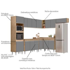 A começar pelo Paneleiro que conta com espaço para micro-ondas e forno elétrico, além de 2 portas para guardar seus utensílios. Na parte inferior você vai contar com 3 Balcões, o Balcão para Pia de 120cm sem tampo é versátil e pode ser personalizado com pia de inox ou granito, de acordo com a sua preferência, o Balcão 80cm com tampo possui 2 Portas e o Balcão de Canto com tampo auxilia na otimização do espaço para aproveitar todos os cantos do ambiente! Já na parte superior, você vai dispor de 4 Armários aéreos, Armário de Geladeira 70cm com porta basculante é prático e funcional, Armário 120cm que conta com 3 portas, Armário 80cm com 2 portas e Armário de Canto com 1 Porta e nichos.