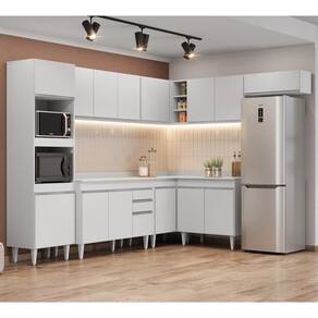 Essa Cozinha Modulada é perfeita para quem gosta de cozinhar e precisa de espaço para armazenar utensílios e eletrodomésticos. Composta por 8 peças, o design clean e os puxadores em alumínio dão um toque moderno ao ambiente! Vem conhecer os componentes dessa linda Cozinha! A começar pelo Paneleiro que conta com espaço para micro-ondas e forno elétrico, além de 2 portas para guardar seus utensílios. Na parte inferior você vai contar com 3 Balcões, o Balcão para Pia de 120cm com tampo é versátil e você pode dispor os itens que mais utiliza para facilitar a sua rotina, o Balcão 80cm com tampo possui 2 Portas e o Balcão de Canto com tampo auxilia na otimização do espaço para aproveitar todos os cantos do ambiente! Já na parte superior, você vai dispor de 4 Armários aéreos, Armário de Geladeira 70cm com porta basculante é prático e funcional, Armário 120cm que conta com 3 portas, Armário 80cm com 2 portas e Armário de Canto com 1 Porta e nichos. Todos os móveis são produzidos em MDP de 15 mm e acabamento em BP resistentes a riscos e fácil de limpar, já o fundo em MDF de 3 mm garante estabilidade e segurança. Além disso, os móveis possuem dobradiças metálicas nas portas e gavetas com corrediças metálicas assegurando suavidade no abrir e fechar. Os pés em PVC possuem regulagem de altura e são ideais para corrigir pequenos desníveis de piso.
