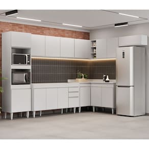 Conteúdo da Embalagem: 1 Balcão 150cm, 1 Balcão 80cm, 1 Armário Aéreo 150cm, 1 Armário Aéreo 80cm, 1 Armário Aéreo 70cm, 1 Balcão de Canto, 1 Armário Aéreo de Canto, 1 Paneleiro.