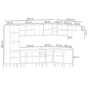 Conteúdo da Embalagem: 1 Balcão 150cm, 1 Balcão 80cm, 1 Armário Aéreo 150cm, 1 Armário Aéreo 80cm, 1 Armário Aéreo 70cm, 1 Balcão de Canto, 1 Armário Aéreo de Canto, 1 Paneleiro.