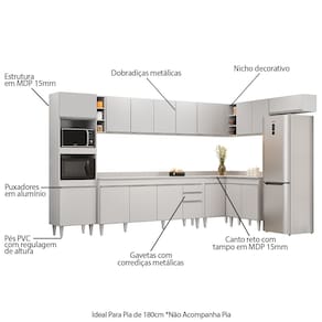 Conteúdo da Embalagem: 1 Balcão 180cm, 1 Tampo 180cm, 1 Armário Aéreo 160cm, 1 Armário Aéreo 70cm, 1 Armário Aéreo 80cm, 1 Balcão 80cm, 1 Nicho, 1 Balcão de canto, 1 Armário Aéreo de Canto, 1 Paneleiro.