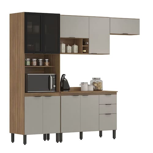 O Armário de Cozinha Modulada Rubi Compacta é a escolha perfeita para quem busca praticidade e design sofisticado. Com 9 portas, 3 gavetas telescópicas e 7 prateleiras, oferece amplo espaço para organização.