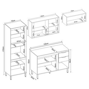 Ideal para cozinhas modernas, áreas gourmet ou apartamentos, o Armário Rubi é compacto por fora e espaçoso por dentro, otimizado para atender todas as suas necessidades. Dimensões: 260x219x52cm (balcão/torre) e 29cm (aéreo).
