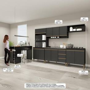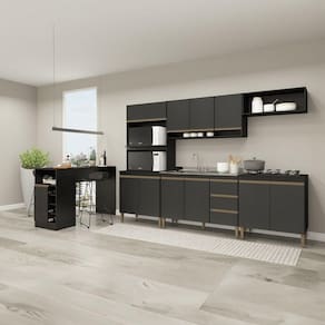 Armário De Cozinha Modulada Torre Quente Sabrina Menu Móveis Preto A Cozinha Modulada Sabrina foi desenvolvida para atender todas as suas necessidades do dia a dia com um design moderno, cheio de atitude, personalidade, funcionalidade, beleza e versatilidade. A Cozinha preta e a tendencia do momento e foi arquitetada com modulos uteis que vao facilitar a sua rotina diaria nos preparos dos alimentos e armazenamento dos utensilios e mantimentos, mantendo sua cozinha sempre organizada. Por se tratar de armarios de cozinha modulados voce pode ajustar os modulos conforme o espaco disponivel e montar diversas modulacoes diferentes para deixar o ambiente muito mais aconchegante. A elegancia fica por conta dos puxadores em perfil e os pes dando um toque unico de sofisticacao. A Cozinha Sabrina e produzida com materiais de excelente qualidade, garantindo a durabilidade e vida util. O melhor em moveis no design atual aliando conforto, qualidade e otimos precos, so na Menu Moveis! Caracteristicas: Produzida em MDP de 15 mm Acabamento UV Texturizado Portas com Dobradica Metalica Gavetas com Corredica Telescopica Puxadores Perfil ABS Pes Regulares ABS Balcao para Cooktop possui Tampo com Ranhura que pode ser utilizado com cooktop de 5 bocas, caso nao cortar pode utilizar normalmente. NAO acompanha TAMPO e PIA