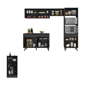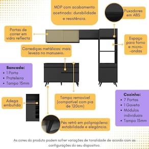 Conteúdo da Embalagem: 1 (um) Armário Aéreo 70cm 1 (um) Armário Aéreo com Portas de Vidro 120cm 1 (um) Balcão com Tampo 120cm 1 (um) Armário para Forno e Micro-Ondas 62cm 1 (uma) Bancada/Mesa Manual de Montagem Kit Ferragem