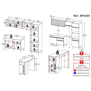 Dimensões do produto montado: Cozinha - Altura: 203cm | Largura: 252cm | Profundidade: 53cm Bancada/Mesa - Altura: 91,5cm | Largura: 137cm | Profundidade: 45cm Espaço para Fogão/Geladeira - Altura: 170cm | Largura: 70cm *Você pode consultar as medidas detalhadas na imagem técnica do produto.