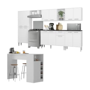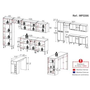 Dimensões do produto montado: Cozinha - Altura: 191cm - Largura: 301cm - Profundidade: 45cm Bancada/Mesa - Altura: 91,5cm | Largura: 137cm | Profundidade: 45cm Espaço para Fogão/Geladeira: Altura: 168cm | Largura: 63cm *Você pode consultar as medidas detalhadas na imagem técnica do produto.