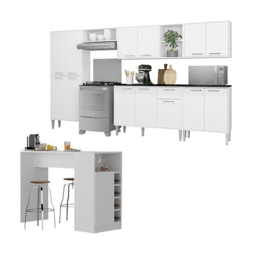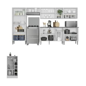 O Armário de Cozinha Modulado com Bancada Americana Xangai Multimóveis MP2206 é a solução perfeita para quem busca funcionalidade, estilo e organização na cozinha. Produzido em MDP com acabamento acetinado (cerca de 20% de brilho), proporciona durabilidade. Com 13 portas embutidas, 1 gaveta com corrediças telescópicas em aço (possuem travas de segurança para evitar acidentes), prateleiras, nichos e compartimento especial para utensílios mais altos, oferece amplo espaço para organização e praticidade no dia a dia. Os pés em polipropileno com regulagem de altura garantem estabilidade e facilidade na limpeza do piso, enquanto os puxadores em ABS com acabamento cromado adicionam um toque de elegância ao móvel. Os tampos de 15mm dos balcões e da bancada são resistentes e oferecem uma superfície prática para o preparo de alimentos e demais tarefas na cozinha. O tampo do balcão é removível (compatível apenas com pia sob medida). Os módulos são individuais, permitindo a montagem de acordo com o espaço. A bancada (suporta até 20kg) possui 1 porta, prateleira interna e adega embutida, deixando as bebidas ao alcance das mãos, além de poder ser utilizada como divisora de ambientes.