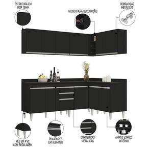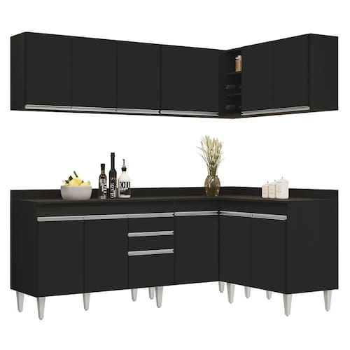 Transforme a sua cozinha em um ambiente prático e funcional com o Armário de Cozinha Modulado de Canto 6 Peças CP29 Balcão com Tampo Preto, da Lumil, você terá tudo o que precisa ao seu alcance. Composto por 6 peças inteligentemente projetadas com balcão gabinete com tampo, armários aéreos, balcão de canto e balcão 2 portas, esse armário modulado oferece uma interna perfeita para organizar todos os seus utensílios.