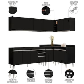 Altura: 1 | AssemblyRequired: Sim, sugerimos a contratação do nosso serviço de montagem (para os CEPs em que o serviço está dispon | Color: Preto | ColorFamily: Preto | ColorSimple: Preto | ColorSupplier: Preto | Gênero: Unisex | Largura: 1 | Manual: Sim | Marca: Lumil Móveis | Material: Lumil Móveis | MaterialFamily: MDP | Model: CP 31 | Origem: | OriginCountry: | OriginState: PR | Peso: 157 kg | Peso Suportado: 159 kg | ProductContents: 1 Balcão 150cm, 1 Armário Aéreo 150cm, 1 Armário Aéreo 80cm, 1 Balcão 80cm, 1 Balcão de canto, 1 Arm | ProductHeight: 202 | ProductInstructions: Produto para uso em ambiente interno, nao devendo ficar exposto ao sol, calor e umidade excessivos. | ProductLength: 50 | ProductWarranty: 90 dias após o do produto | ProductWeight: 157 kg | ProductWidth: 371 | Profundidade: 50 cm | Requere montagem: Sim | SizeDescription: 202 x 371 x 50 cm | SupplierSimpleName: Armário de Cozinha Modulado de Canto 6 Peças CP31 Balcão sem Tampo Preto - Lumil | Tipo de : Fabricante