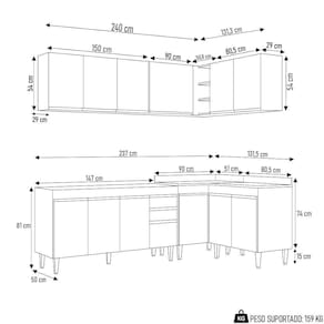 Conteúdo da Embalagem: 1 Balcão 150cm, 1 Armário Aéreo 150cm, 1 Armário Aéreo 80cm, 1 Balcão 80cm, 1 Balcão de canto, 1 Armário Aéreo de Canto.