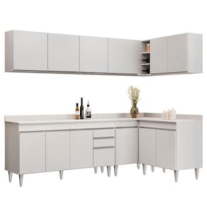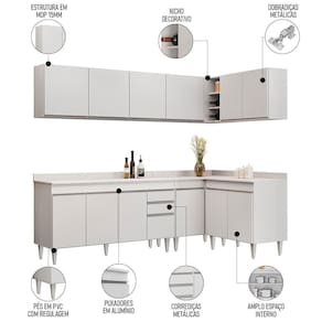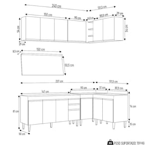 Conteúdo da Embalagem: 1 Balcão 150cm, 1 Armário Aéreo 150cm, 1 Armário Aéreo 80cm, 1 Balcão 80cm, 1 Balcão de canto, 1 Armário Aéreo de Canto, 1 Tampo 150cm.