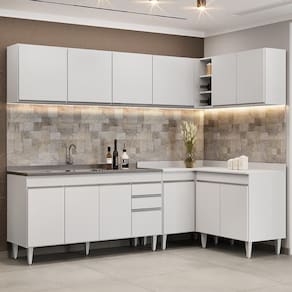 Além de ser composto por peças essenciais, como balcão para pia 150cm, armários aéreos, balcão de canto e balcão 2 portas, esse jogo de cozinha completo ainda conta com uma maior resistência contra riscos e umidade, garantindo sua durabilidade por muito tempo, graças ao acabamento em BP. Já os pés ajustáveis permitem você nivelar o móvel em qualquer tipo de piso. Para completar, o design contemporâneo dessa cozinha de canto se adapta facilmente a qualquer estilo de decoração, ao passo que a configuração de canto otimiza a circulação no ambiente.