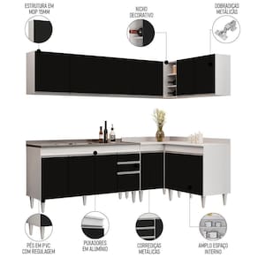 Altura: 1 | AssemblyRequired: Sim, sugerimos a contratação do nosso de montagem (para os CEPs em que o está dispon | Color: BrancoPreto | ColorFamily: BrancoPreto | ColorSimple: BrancoPreto | ColorSupplier: BrancoPreto | Gênero: Unisex | Largura: 1 | Manual: Sim | Marca: Lumil Móveis | Material: Lumil Móveis | MaterialFamily: MDP | Model: CP 33 | Origem: | OriginCountry: | OriginState: PR | Peso: Não | Peso Suportado: 159 kg | ProductContents: 1 Balcão 150cm, 1 Armário Aéreo 150cm, 1 Armário Aéreo 80cm, 1 Balcão 80cm, 1 Balcão de canto, 1 Arm | ProductHeight: 202 | ProductInstructions: Produto para uso em ambiente interno, nao devendo ficar exposto ao sol, calor e umidade excessivos. | ProductLength: 50 | ProductWarranty: 90 dias após o do produto | ProductWeight: 173 | ProductWidth: 371 | Profundidade: 1 Balcão 150cm, 1 Armário Aéreo 150cm, 1 Armário Aéreo 80cm, 1 Balcão 80cm, 1 Balcão de canto, 1 Arm | Requere montagem: Sim | SizeDescription: 202 x 371 x 50 cm | SupplierSimpleName: Armário de Cozinha Modulado de Canto 6 Peças CP33 com Pia Inox BrancoPreto - Lumil | Tipo de Garantia: Fabricante