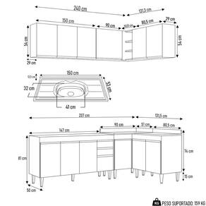 Conteúdo da Embalagem: 1 Balcão 150cm, 1 Armário Aéreo 150cm, 1 Armário Aéreo 80cm, 1 Balcão 80cm, 1 Balcão de canto, 1 Armário Aéreo de Canto, 1 Pia Inox 150cm.