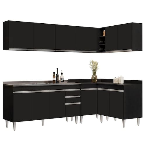 Procura uma cozinha prática e funcional?! Então, acaba de encontrar. Com o Armário de Cozinha Modulado de Canto 6 Peças CP33 com Pia Inox Preto, da Lumil, você terá tudo o que precisa ao seu alcance. Composto por 6 peças inteligentemente projetadas, esse armário modulado oferece uma interna perfeita para organizar todos os seus utensílios. Além de ser composto por peças essenciais, como balcão para pia 150cm, armários aéreos, balcão de canto e balcão 2 portas, esse jogo de cozinha completo ainda conta com uma maior resistência contra riscos e umidade, garantindo sua durabilidade por muito tempo, graças ao acabamento em BP. Já os pés ajustáveis permitem você nivelar o móvel em qualquer tipo de piso. Para completar, o design contemporâneo dessa cozinha de canto se adapta facilmente a qualquer estilo de decoração, ao passo que a configuração de canto otimiza a circulação no ambiente. Então, aproveite cada centímetro do seu espaço com esse armário de cozinha versátil e funcional. Invista em qualidade e praticidade para sua cozinha hoje mesmo! ESPECIFICAÇÕESDimensões do Produto: Largura: Superior: 240 x 131,3 cm/ Inferior: 237 x 131,5 cm. Altura: 202 cm. Profundidade: Superior: 29 cm / Inferior: 50 x 51 cm. Peso Total: 173 kg. Outras medidas: (Largura x Altura x Profundidade): Balcão Gabinete 150cm Marrocos: 147 x 81 x 50 cm. Balcão 80cm Florida: 80,5 x 89 x 51 cm. Balcão de Canto Denver: 90 x 89 x 51 cm. Armário Aéreo 150cm Argélia: 150 x 54 x 29 cm. Armário Aéreo 80cm Califórnia: 80,5 x 54 x 29 cm. Armário Aéreo de Canto Austin: 90 x 54 x 50,8 cm. Pia Inox: 150 x 13,5 x 53 cm. Características do Produto: Material da Estrutura: MDP 15 mm. Material do fundo: MDF 3mm. Peso Suportado: 159 kg distribuídos. Acabamento: Melamina BP. Escala de brilho: Fosco. Possui Tampo: Sim. Possui Pia: Sim. Possui Portas: Sim. Material da Porta: MDP. Quantidade de Portas: 13 Portas. Tipo de dobradiças: Metálicas. Tipo de Porta: Convencional. Possui Gavetas: Sim. Material da Gaveta: MDP. Quantidade de Gavetas: 2 Gavetas. Tipo de corrediças: Metálicas. Possui Nichos: Sim. Quantidade de Nichos: 3 Nichos. Tipo de puxador: Alumínio. Possui Pés: Sim. Diferenciais: - Amplo espaço interno. - Puxadores em alumínio. - Design moderno. - Pés Reguláveis em PVC. - Balcão de canto e balcão 2 portas ambos com tampo. - Pia inox com traseiro concretado, cuba com rebaixe novitá, válvula e pino metálico. Sistema de Montagem: Parafusos e Cavilhas. Manual de Montagem: Sim. Complexidade da Montagem: Alta. Conteúdo da Embalagem: 1 Balcão 150cm, 1 Armário Aéreo 150cm, 1 Armário Aéreo 80cm, 1 Balcão 80cm, 1 Balcão de canto, 1 Armário Aéreo de Canto, 1 Pia Inox 150cm. Garantia do Fabricante: 90 dias contra defeitos de fabricação. Volumes: 7 Volumes. Montagem: Recomendamos que seja feita por um . Recomendação de Limpeza: Utilize pano levemente úmido. Observações importantes: - Produto para uso residencial em ambiente interno, não devendo ficar exposto diretamente ao sol, calor e umidades excessivas. - Pode haver alguma diferença de tonalidade entre a imagem e o produto real, por conta do tratamento de imagens e a calibração de cores do seu monitor. - As imagens são meramente ilustrativas, não acompanham objetos de decoração e eletrônicos. - Ao receber a mercadoria, o cliente deve verificar as condições da embalagem, caso haja alguma não assine o de . - Montagem, desmontagem e outras instalações serão de responsabilidade do cliente. Não nos responsabilizamos, no ato da , por subir escadas/elevadores ou pelo por guincho em apartamentos. Eventuais despesas são de responsabilidade do comprador. - Confira as dimensões do produto e certifique-se de que passará normalmente por supostos elevadores, portas, escadas e/ou corredores de sua residência.