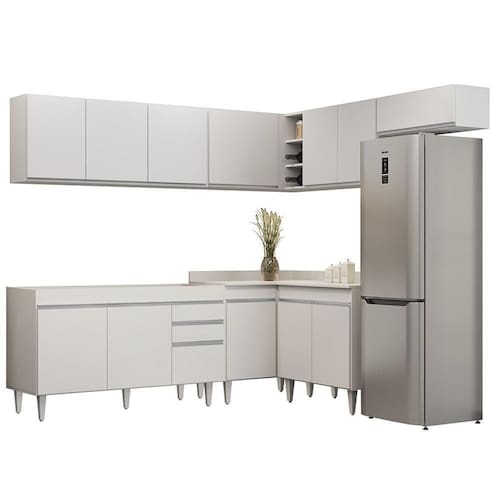 Além de ser composto por peças essenciais, como balcão para pia 150cm, armários aéreos, balcão de canto e balcão 2 portas, esse jogo de cozinha completo ainda conta com uma maior resistência contra riscos e umidade, garantindo sua durabilidade por muito tempo, graças ao acabamento em BP. Já os pés ajustáveis permitem você nivelar o móvel em qualquer tipo de piso. Para completar, o design contemporâneo dessa cozinha de canto se adapta facilmente a qualquer estilo de decoração, ao passo que a configuração de canto otimiza a circulação no ambiente.