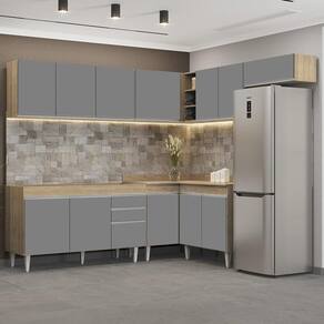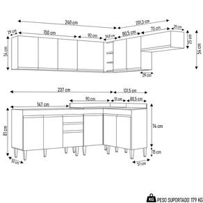 Conteúdo da Embalagem: 1 Balcão 150cm, 1 Armário Aéreo 150cm, 1 Armário Aéreo 70cm, 1 Armário Aéreo 80cm, 1 Balcão 80cm, 1 Balcão de canto, 1 Armário Aéreo de Canto.