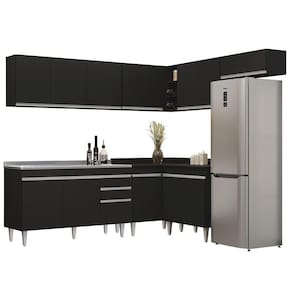 Procura uma cozinha prática e funcional?! Então, acaba de encontrar. Com o Armário de Cozinha Modulado de Canto 7 Peças CP24 com Pia Inox Preto, da Lumil, você terá tudo o que precisa ao seu alcance. Composto por 7 peças inteligentemente projetadas, esse armário modulado oferece uma distribuição interna perfeita para organizar todos os seus utensílios. Além de ser composto por peças essenciais, como balcão gabinete com tampo, armários aéreos, balcão de canto e balcão 2 portas, esse jogo de cozinha completo ainda conta com uma maior resistência contra riscos e umidade, garantindo sua durabilidade por muito tempo, graças ao acabamento em BP. Já os pés ajustáveis permitem você nivelar o móvel em qualquer tipo de piso. Para finalizar, o tampo de pia inox completa a funcionalidade, ao passo que o design contemporâneo dessa cozinha de canto se adapta facilmente a qualquer estilo de decoração, ao passo que a configuração de canto otimiza a circulação no ambiente. Então, aproveite cada centímetro do seu espaço com esse armário de cozinha versátil e funcional. Invista em qualidade e praticidade para sua cozinha hoje mesmo! ESPECIFICAÇÕESDimensões do Produto: Largura: Superior: 240 x 201,3 cm/ Inferior: 237 x 131,5 cm. Altura: 202 cm. Profundidade: Superior: 29 cm / Inferior: 51 x 50 cm. Peso Total: 181 kg. Outras medidas: (Largura x Altura x Profundidade): Balcão Gabinete 150cm Marrocos: 147 x 81 x 50 cm. Balcão 80cm Florida: 80,5 x 89 x 51 cm. Balcão de Canto Denver: 90 x 89 x 51 cm. Armário Aéreo 150cm Argélia: 150 x 54 x 29 cm. Armário Aéreo 70cm Texas: 70 x 25 x 29 cm. Armário Aéreo 80cm Califórnia: 80,5 x 54 x 29 cm. Armário Aéreo de Canto Austin: 90 x 54 x 50,8 cm. Pia Inox: 150 x 13,5 x 53 cm. Características do Produto: Material da Estrutura: MDP 15 mm. Material do fundo: MDF 3mm. Peso Suportado: 179 kg distribuídos. Acabamento: Melamina BP. Escala de brilho: Fosco. Possui Tampo: Sim. Possui Pia: Sim. Possui Portas: Sim. Material da Porta: MDP. Quantidade de Portas: 14 Portas. Tipo de dobradiças: Metálicas. Tipo de Porta: 13 Convencional, 1 Basculante. Possui Gavetas: Sim. Material da Gaveta: MDP. Quantidade de Gavetas: 2 Gavetas. Tipo de corrediças: Metálicas. Possui Nichos: Sim. Quantidade de Nichos: 3 Nichos. Tipo de puxador: Alumínio. Possui Pés: Sim. Diferenciais: - Amplo espaço interno. - Puxadores em alumínio. - Design moderno. - Pés Reguláveis em PVC. - Balcão de canto e balcão 2 portas com tampo. - Pia inox com traseiro concretado, cuba com rebaixe novitá, válvula e pino metálico. Sistema de Montagem: Parafusos e Cavilhas. Manual de Montagem: Sim. Complexidade da Montagem: Alta. Conteúdo da Embalagem: 1 Balcão 150cm, 1 Armário Aéreo 150cm, 1 Armário Aéreo 70cm, 1 Armário Aéreo 80cm, 1 Balcão 80cm, 1 Balcão de canto, 1 Armário Aéreo de Canto, 1 Pia Inox. Garantia do Fabricante: 90 dias contra defeitos de fabricação. Volumes: 8 Volumes. Montagem: Recomendamos que seja feita por um . Recomendação de Limpeza: Utilize pano levemente úmido. Observações importantes: - Produto para uso residencial em ambiente interno, não devendo ficar exposto diretamente ao sol, calor e umidades excessivas. - Pode haver alguma diferença de tonalidade entre a imagem e o produto real, por conta do tratamento de imagens e a calibração de cores do seu monitor. - As imagens são meramente ilustrativas, não acompanham objetos de decoração e eletrônicos. - Ao receber a mercadoria, o cliente deve verificar as condições da embalagem, caso haja alguma dano não assine o comprovante de recebimento. - Montagem, desmontagem e outras instalações serão de responsabilidade do cliente. Não nos responsabilizamos, no ato da entrega, por subir escadas/elevadores ou pelo transporte por guincho em apartamentos. Eventuais despesas são de responsabilidade do comprador. - Confira as dimensões do produto e certifique-se de que passará normalmente por supostos elevadores, portas, escadas e/ou corredores de sua residência.