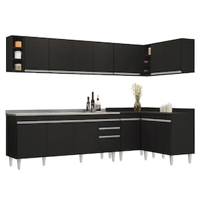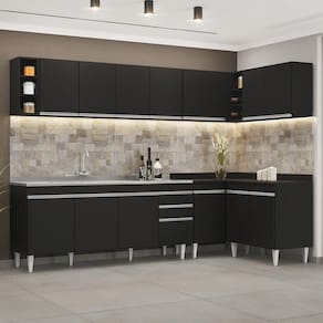 Renove a sua cozinha com o Armário de Cozinha Modulado de Canto 7 Peças CP36 com Pia Inox Preto, da Lumil, você terá tudo o que precisa ao seu alcance. Composto por 7 peças inteligentemente projetadas, esse armário modulado oferece uma interna perfeita para organizar todos os seus utensílios. Além de ser composto por peças essenciais, como balcão gabinete com pia, armários aéreos, balcão de canto com nicho garrafeiro e balcão 2 portas, esse jogo de cozinha completo ainda conta com uma maior resistência contra riscos e umidade, garantindo sua durabilidade por muito tempo, graças ao acabamento em BP. Já os pés ajustáveis permitem você nivelar o móvel em qualquer tipo de piso. Para finalizar, a pia inox completa a funcionalidade, enquanto o design contemporâneo dessa cozinha de canto harmoniza facilmente com qualquer estilo de decoração e otimiza a circulação no ambiente. Então, aproveite cada centímetro do seu espaço com esse armário de cozinha versátil e funcional. Invista em qualidade e praticidade para sua cozinha hoje mesmo! ESPECIFICAÇÕESDimensões do Produto: Largura: Superior: 270 x 131,3 cm/ Inferior: 267 x 131,5 cm. Altura: 202 cm. Profundidade: Superior: 29 cm / Inferior: 50 x 51 cm. Peso Total: 188 kg. Outras medidas: (Largura x Altura x Profundidade): Balcão Gabinete 180cm Dallas: 177 x 83 x 50 cm. Balcão 80cm Florida: 80,5 x 89 x 51 cm. Balcão de Canto Denver: 90 x 89 x 51 cm. Armário Aéreo 160cm Nevada: 160 x 54 x 29 cm. Armário Aéreo 80cm Califórnia: 80,5 x 54 x 29 cm. Armário Aéreo de Canto Austin: 90 x 54 x 50,8 cm. Nicho Riad: 20 x 54 x 27 cm. Pia Inox: 180 x 13,5 x 56 cm. Características do Produto: Material da Estrutura: MDP 15 mm. Material do fundo: MDF 3mm. Peso Suportado: 180 kg distribuídos. Acabamento: Melamina BP. Escala de brilho: Fosco. Possui Tampo: Sim. Possui Pia: Sim. Possui Portas: Sim. Material da Porta: MDP. Quantidade de Portas: 14 Portas. Tipo de dobradiças: Metálicas. Tipo de Porta: Convencional. Possui Gavetas: Sim. Material da Gaveta: MDP. Quantidade de Gavetas: 2 Gavetas. Tipo de corrediças: Metálicas. Possui Nichos: Sim. Quantidade de Nichos: 6 Nichos. Tipo de puxador: Alumínio. Possui Pés: Sim. Diferenciais: - Amplo espaço interno. - Puxadores em alumínio. - Design moderno. - Pés Reguláveis em PVC. - Balcão de canto e balcão 2 portas ambos com tampo. - Pia inox com traseiro concretado, cuba com rebaixe novitá, válvula e pino metálico. Sistema de Montagem: Parafusos e Cavilhas. Manual de Montagem: Sim. Complexidade da Montagem: Alta. Conteúdo da Embalagem: 1 Balcão 180cm, 1 Armário Aéreo 160cm, 1 Armário Aéreo 80cm, 1 Balcão 80cm, 1 Balcão de canto, 1 Armário Aéreo de Canto, 1 Nicho, 1 Pia Inox 180cm. Garantia do Fabricante: 90 dias contra de fabricação. Volumes: 9 Volumes. Montagem: Recomendamos que seja feita por um . Recomendação de Limpeza: Utilize pano levemente úmido. Observações importantes: - Produto para uso residencial em ambiente interno, não devendo ficar exposto diretamente ao sol, calor e umidades excessivas. - Pode haver alguma diferença de tonalidade entre a imagem e o produto real, por conta do tratamento de imagens e a calibração de cores do seu monitor. - As imagens são meramente ilustrativas, não acompanham objetos de decoração e eletrônicos. - Ao receber a mercadoria, o cliente deve verificar as condições da embalagem, caso haja alguma não assine o de . - Montagem, desmontagem e outras instalações serão de responsabilidade do cliente. Não nos responsabilizamos, no ato da , por subir escadas/elevadores ou pelo por guincho em apartamentos. Eventuais despesas são de responsabilidade do comprador. - Confira as dimensões do produto e certifique-se de que passará normalmente por supostos elevadores, portas, escadas e/ou corredores de sua residência.