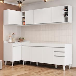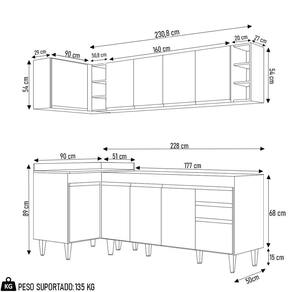 Conteúdo da Embalagem: 1 Balcão 180cm, 1 Armário Aéreo 160cm, 1 Balcão de canto, 1 Armário Aéreo de Canto, 1 Nicho.