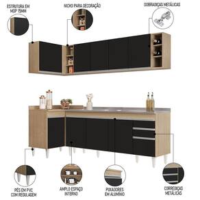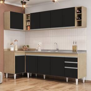 Conteúdo da Embalagem: 1 Balcão 180cm, 1 Armário Aéreo 160cm, 1 Balcão de canto, 1 Armário Aéreo de Canto, 1 Nicho, 1 Pia Inox 180cm.