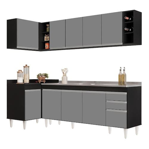 Renove a sua cozinha com o Armário de Cozinha Modulado de Canto Direito 5 Peças CP45 com Pia Inox Preto/Cinza, da Lumil, você terá tudo o que precisa ao seu alcance. Composto por 5 peças, sendo balcão para pia, armários aéreos, balcão de canto e nicho garrafeiro, esse armário modulado oferece uma interna perfeita para organizar todos os seus utensílios.