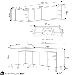 Conteúdo da Embalagem: 1 Balcão 180cm, 1 Armário Aéreo 160cm, 1 Balcão de canto, 1 Armário Aéreo de Canto, 1 Nicho, 1 Pia Inox 180cm.