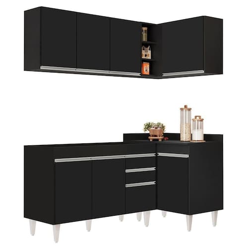 Altura: 202 cm | AssemblyRequired: Sim, sugerimos a contratação do nosso serviço de montagem (para os CEPs em que o serviço está dispon | Color: Preto | ColorFamily: Preto | ColorSimple: Preto | ColorSupplier: Preto | Cor: Preto | Gênero: Unisex | Largura: 261 cm | Manual: Sim | Marca: Mpozenato | Material: MDP | MaterialFamily: MDP | Model: CP 46 | Origem: | OriginCountry: | OriginState: PR | Peso: 108 kg | Peso Suportado: 108 kg | ProductContents: 1 Balcão 120cm, 1 Armário Aéreo 120cm, 1 Balcão de Canto, 1 Armário Aéreo de Canto | ProductHeight: 202 | ProductInstructions: Produto para uso em ambiente interno, nao devendo ficar exposto ao sol, calor e umidade excessivos. | ProductLength: 50 | ProductWarranty: 90 dias após o do produto | ProductWeight: 108 kg | ProductWidth: 261 | Profundidade: 50 cm | Requere montagem: Sim | SizeDescription: 202 x 261 x 50 cm | SupplierSimpleName: Armário de Cozinha Modulado de Canto Esquerdo 4 Peças CP46 Balcão sem Tampo Preto - Lumil | Tipo de : Fabricante