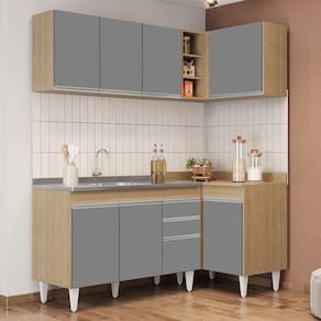 Conteúdo da Embalagem: 1 Balcão 120cm, 1 Armário Aéreo 120cm, 1 Balcão de Canto, 1 Armário Aéreo de Canto, 1 Pia Inox 120cm.